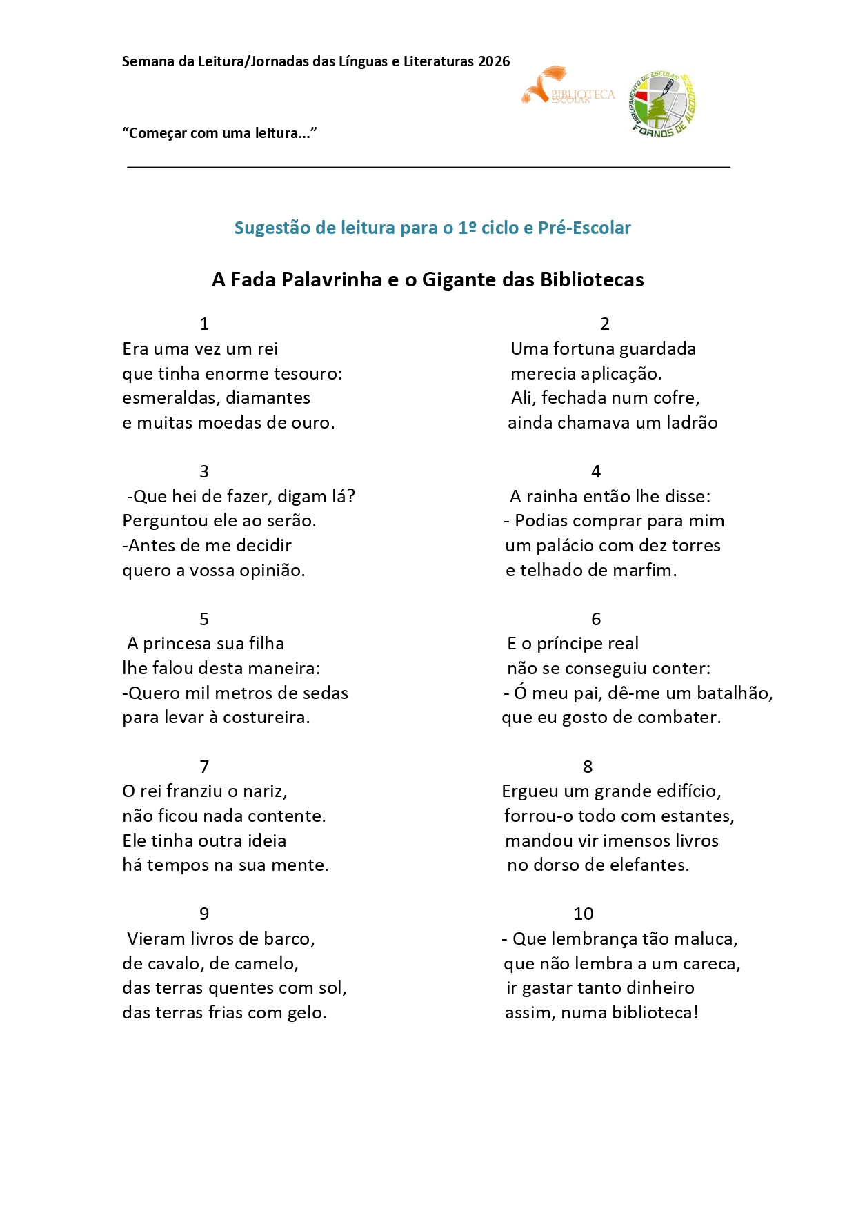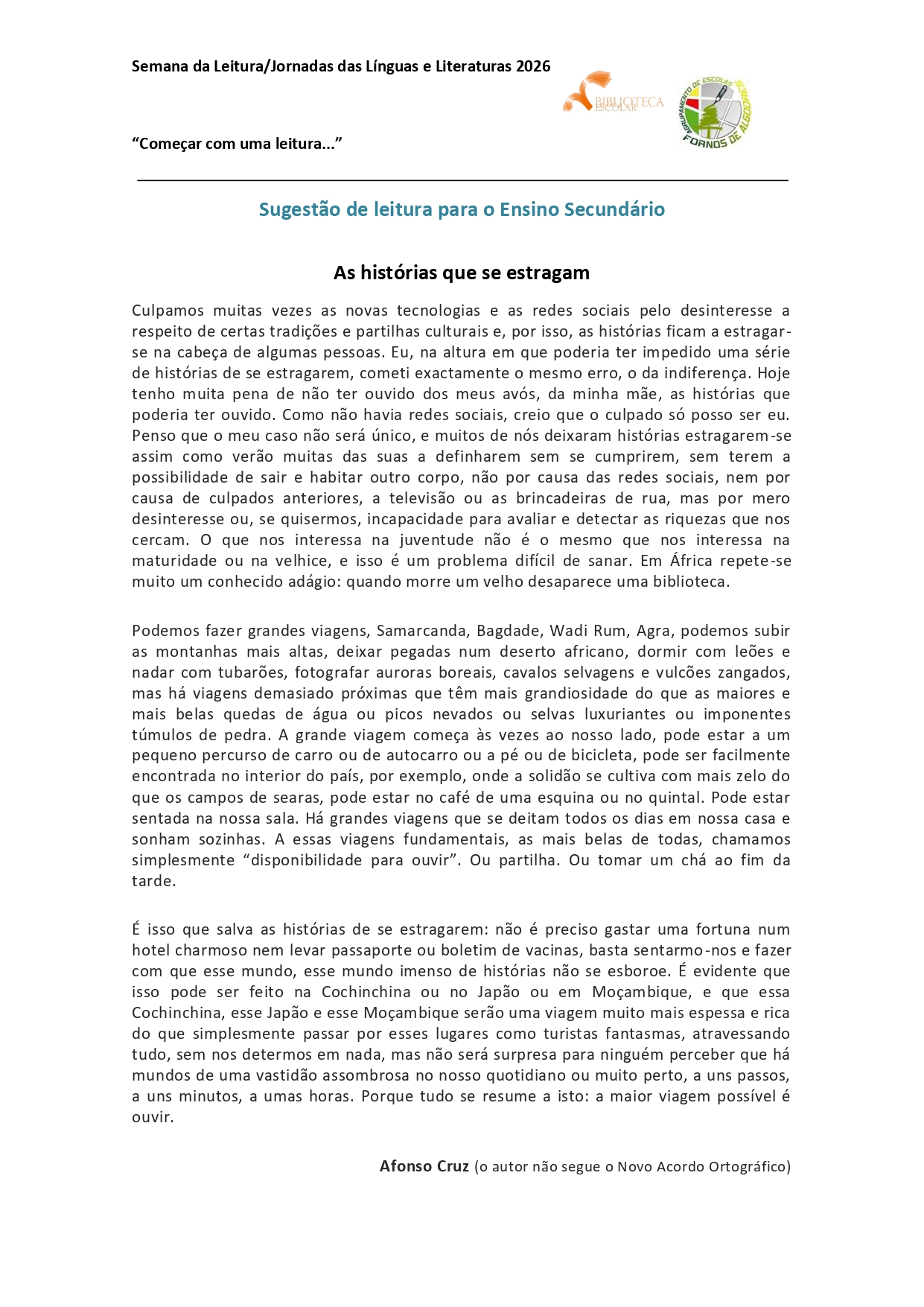 Para começar esta semana, lançámos o desafio “Começar com uma leitura…”. Ao longo desse primeiro dia, todas as turmas do agrupamento deram início às suas atividades com a escuta e partilha de um texto cuidadosamente escolhido, adequado à faixa etária e ao percurso escolar de cada turma. Foi um momento simples, mas cheio de significado: alguns minutos dedicados apenas à leitura, à atenção e ao prazer de descobrir histórias, ideias e emoções.