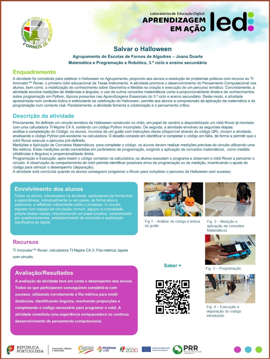 O AEFA orgulha-se de ter sido representado pelos alunos Jéssica Carvalho e Tomás Tadeu, alunos do curso profissional Técnico/a de Eletrónica, Automação e Computadores, que apresentaram e partilharam a prática “Por mares nunca dantes navegados… em código”, uma adaptação à atividade “Salvar o Halloween” – prática educativa de referência em póster.