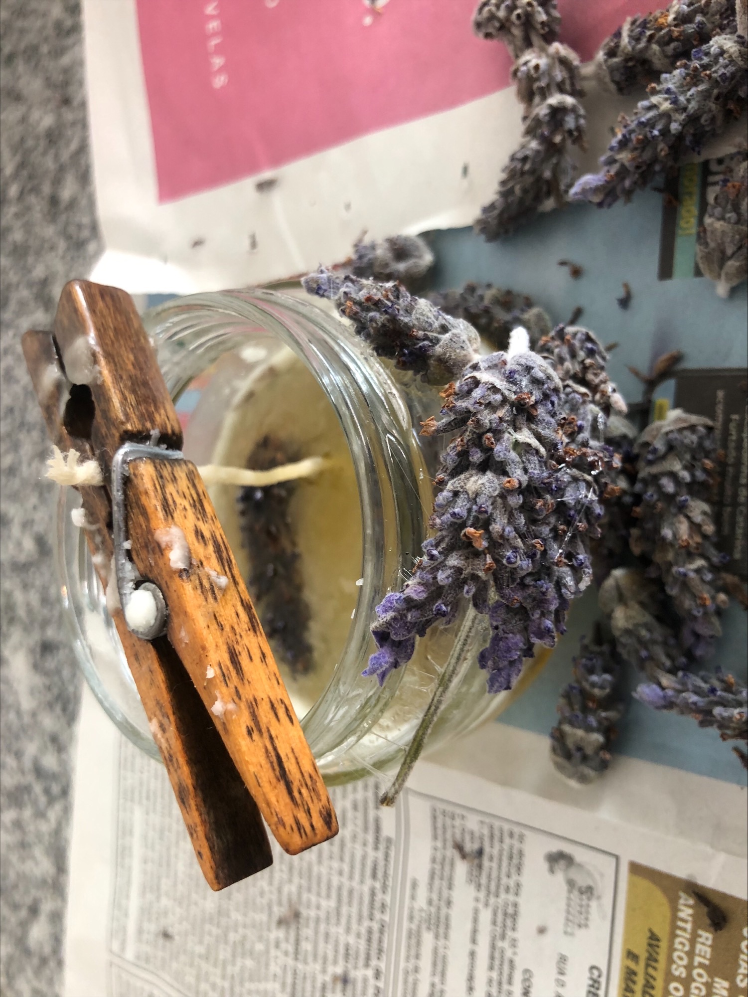 As velas foram aromatizadas com essência e alfazema. O frasco foi decorado ao gosto de cada um!