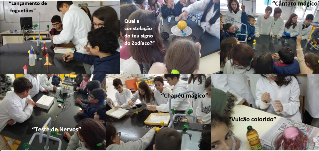 A primeira decorreu no dia 9 de novembro aquando da vinda à escola sede do Agrupamento dos alunos do 3º ano para assistirem à “Sessão de Planetário” dinamizada pela substrutura de Físico-Química e consistiu num “Laboratório Aberto” onde os alunos inscritos no clube dinamizaram várias experiências.